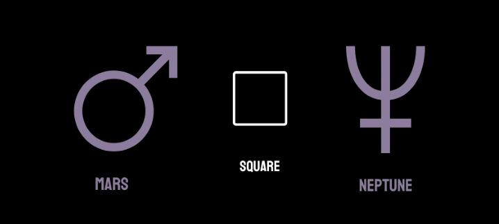 Mars-Neptune is the aspect of the spiritual warrior. With the square (90º), an integrative tension between energized activity and sensitive passivity may be experienced.
