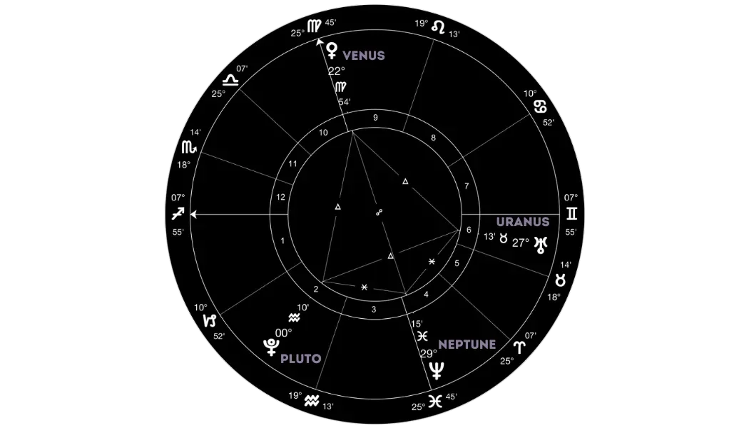 Some of her most notable films include Pulp Fiction, where she delivered an iconic performance as Mia Wallace, a role that earned her an Academy Award nomination. She also starred in the Kill Bill series as The Bride, a vengeful assassin, a role that has become one of her most defining. Thurman’s diverse filmography highlights her range and enduring appeal in the film industry, evoking the beauty, brilliance, mystique, and depth of the Venus-Uranus-Neptune-Pluto alignment. Explore and study Thurman's style of acting and feel into the charming intricacy of this alignment.