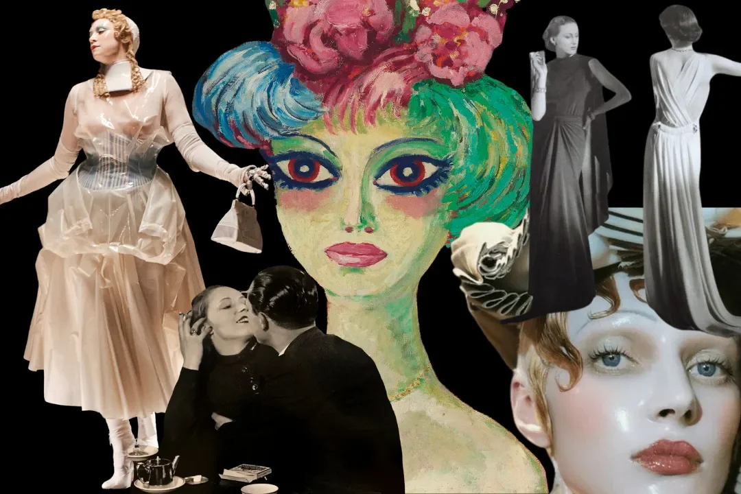 To the left and center: Maison Margiela Artisanal Spring/Summer 2024 collection's twenty-eight and twenty-ninth looks. To the right: Portrait de femme (1877-1968) by Kees Van Dongen.