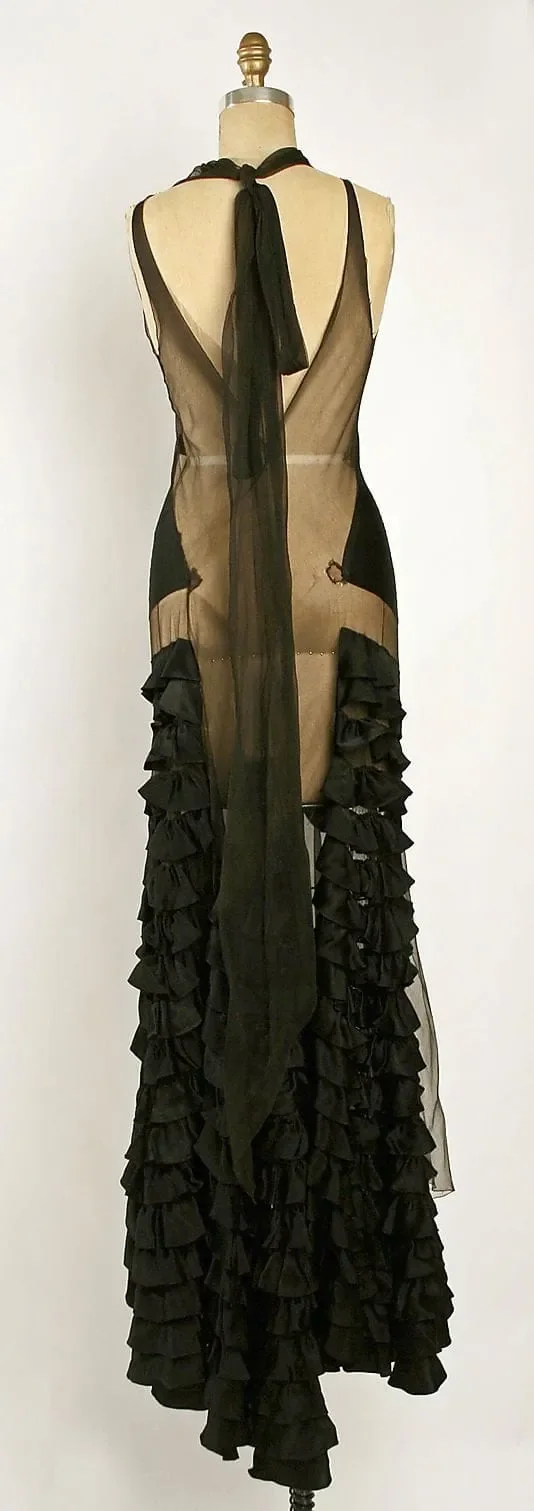 For the second look, we see a beautiful black muslin sheer gown with black chantilly lace that creates a sort of reptilian motif across the model's body. The dress is fully sheer and exposes a significant part of her body. Here, once again, we witness Brassaï's influence. “An image titled A Monastic Brothel from 1931 shows the inside of a brothel with a man in full suit, dancing with a woman who is wearing a completely sheer slip dress that exposes everything, including the crack of her bottom,” explains Meagher. Interestingly, the naked dress trend has been correlated with the Uranus-Pluto cycle. Either way, Brassaï's constant documentation of sex workers and their nudity seems to be an influence here.