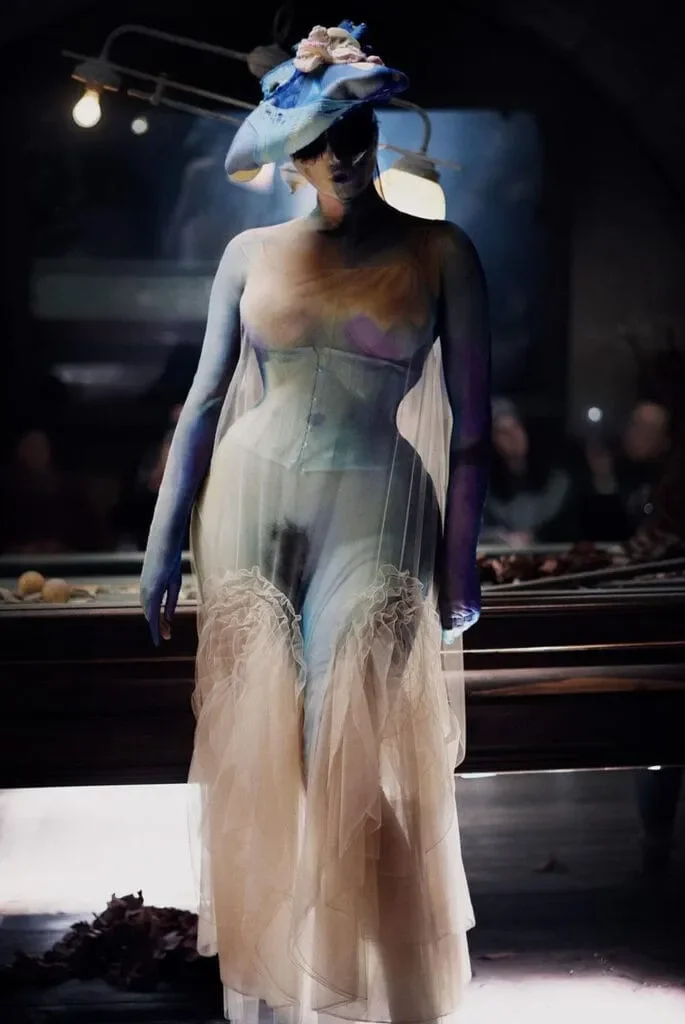 In these dresses, we can also see a Merkin present, something I believe evokes the Uranus-Pluto aesthetic. A Merkin is the idea of showcasing pubic hair underneath a sheer dress. “Galliano was referencing a historical object called the Merkin that came about in the 15th century, when the idea of full pubic bush was highly desired and fashionable, but also, when lice and syphilis caused many to shave their pelvic region for health and safety reasons,” explains Meagher. “From there, people would create pubic wigs with real human hair in order to create the illusion that they had such hair to spare,” he adds. This is something that today, we tend to see as slightly shocking. So is, however, anything that represents the Uranus-Pluto energy, which is what exactly makes the archetype so appealing. “The girls had extensions for the nether regions, to each!” says Meagher, jokingly. It is interesting to note that the Merkin emerged in the 1450s during a Uranus-Pluto conjunction.
