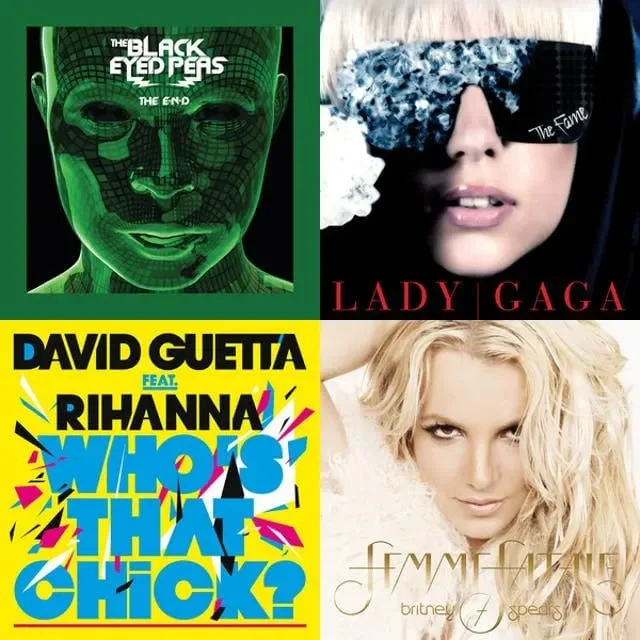 Some albums and singles representative of "recession pop" from the era of the Great Recession (clockwise): The Black Eyed Peas' The E.N.D. (2009), Lady Gaga's The Fame (2008), David Guetta's Who's That Chick? (2010) and Britney Spears' Femme Fatale.