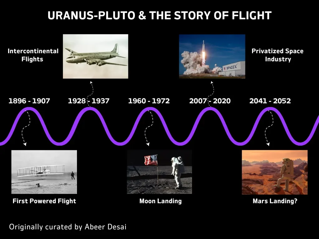 As the graphic indicates, all the major moments in the history of flight (including space exploration) have happened under a Uranus-Pluto alignment.