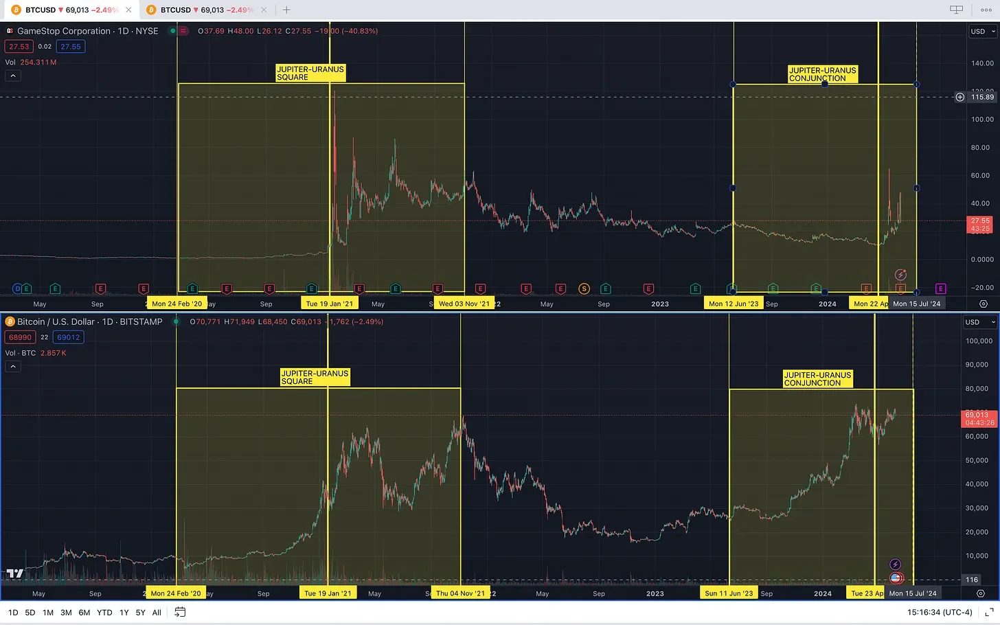 GameStop and Bitcoin both reflect archetypal qualities that are amplified during Jupiter-Uranus transits.