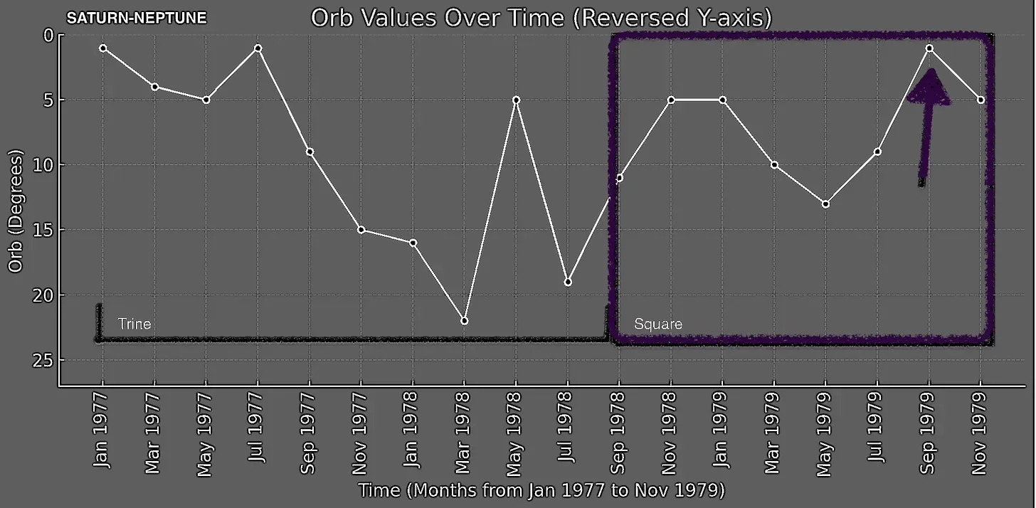 Remarkably, this period overlapped with a powerful Saturn-Neptune alignment. We're talking a trine from early 1977 through September 1978 and a square from September 1978 through the end of 1979. While celestial configurations do not directly influence earthly events, this cosmic coincidence adds an intriguing layer of cosmic context to the resurfacing of such a culturally significant artifact.
